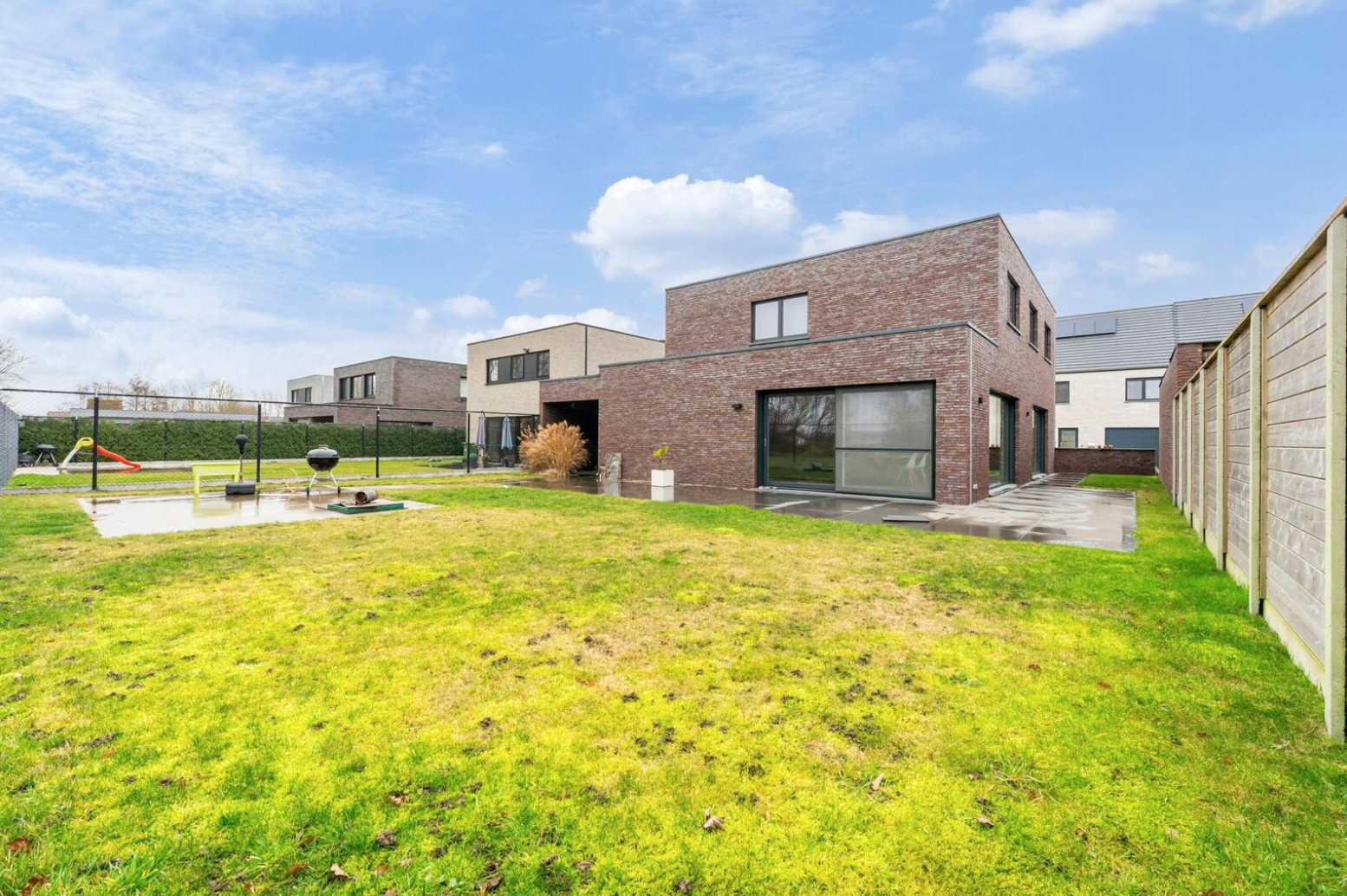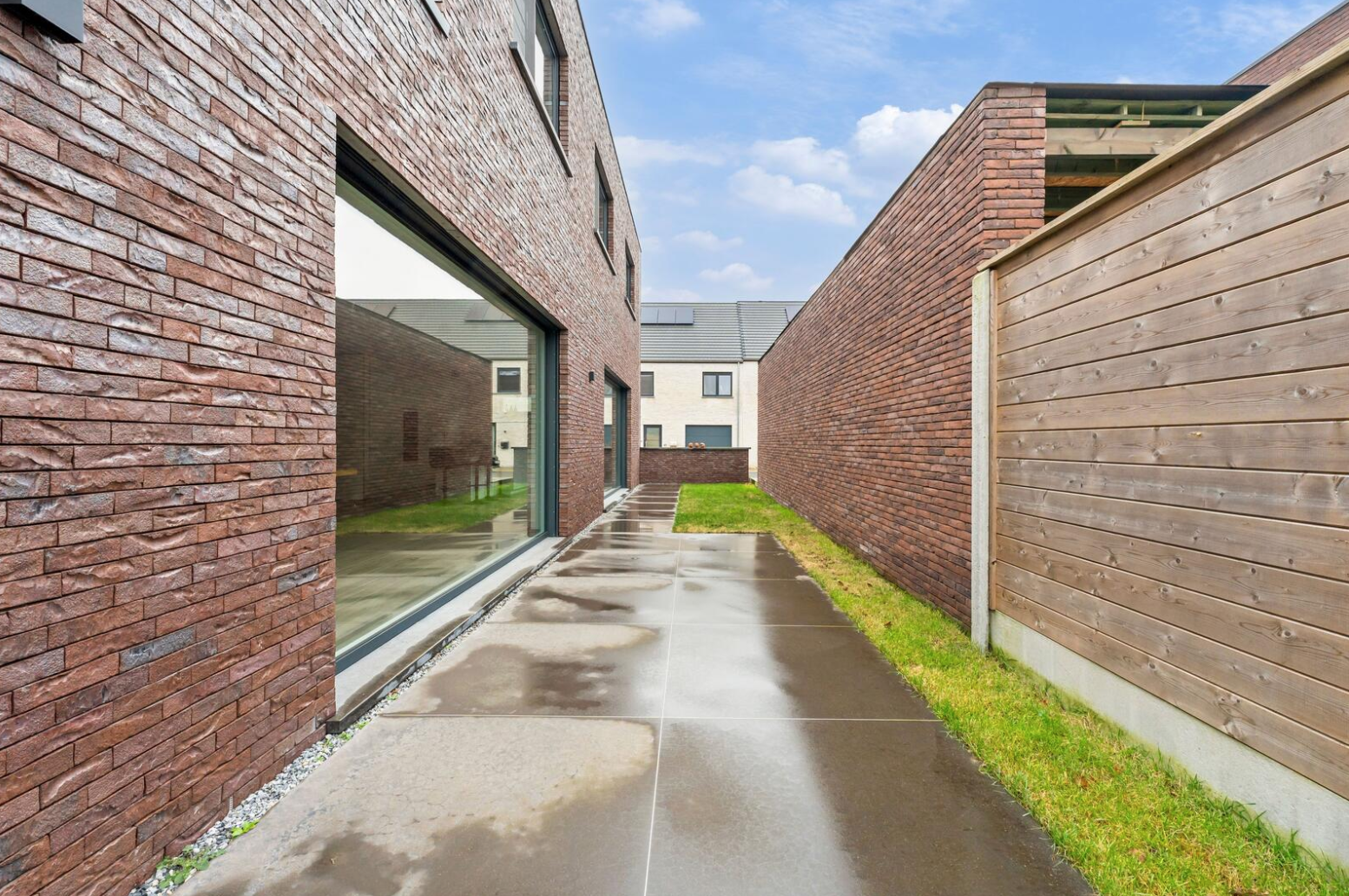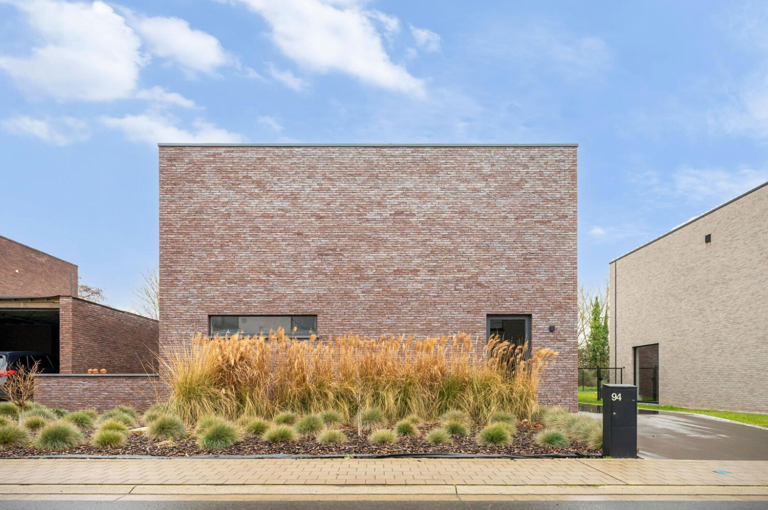 Moderne alleenstaande villa in een rustige wijk te Poperinge. Deze fijne paars-bruine genuanceerde gevelsteen werd niet alleen gebruikt voor de gevel maar ook voor de afwerking van de carport.