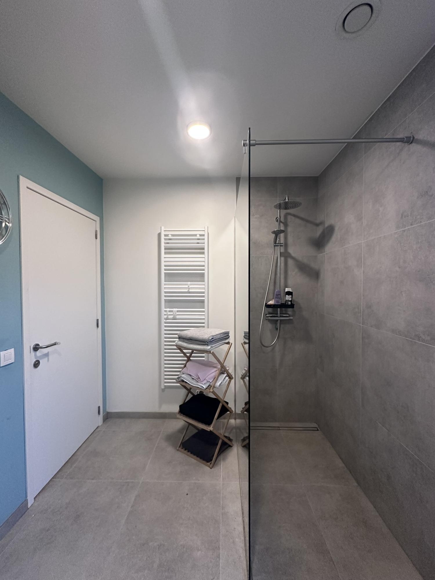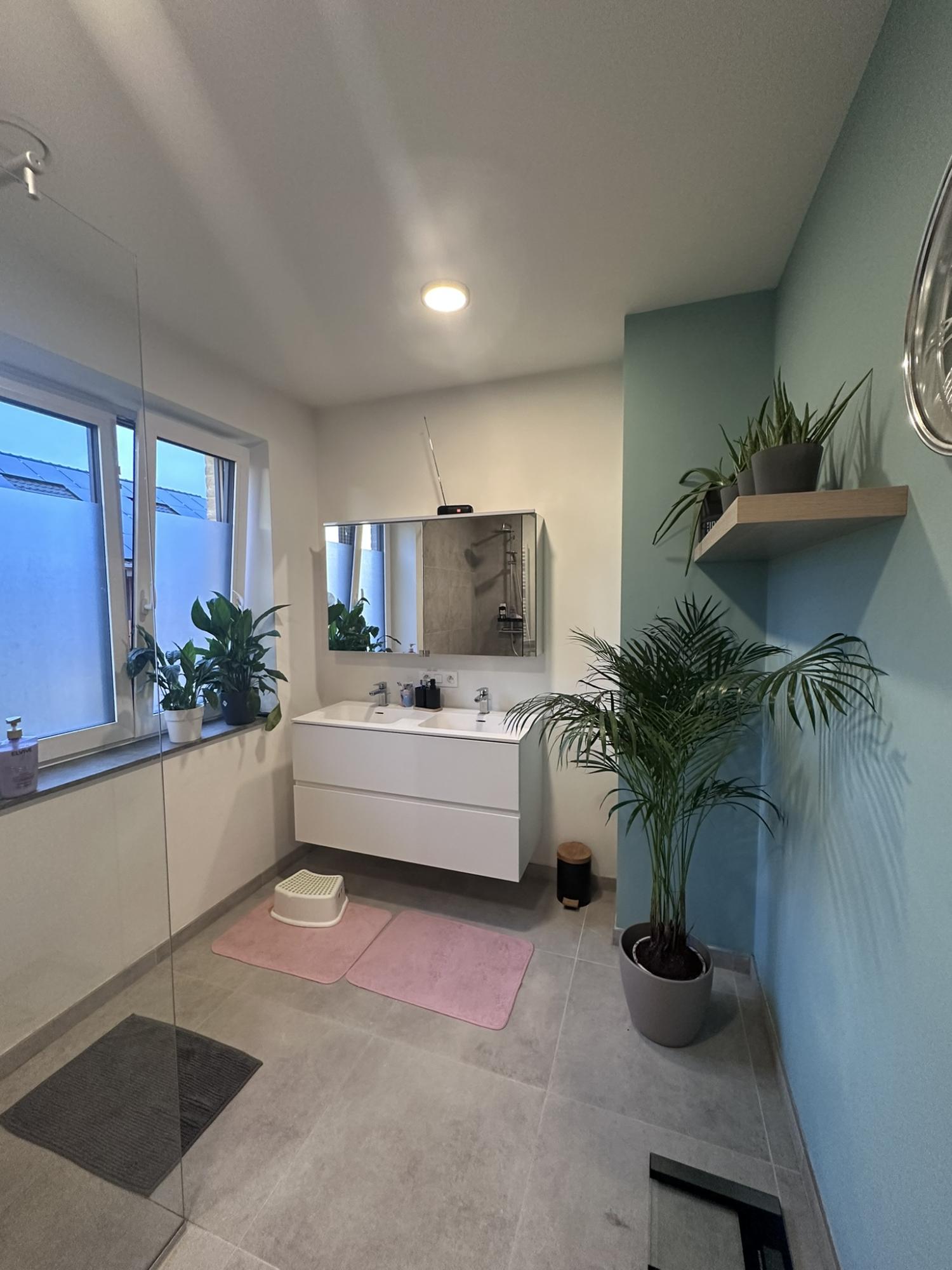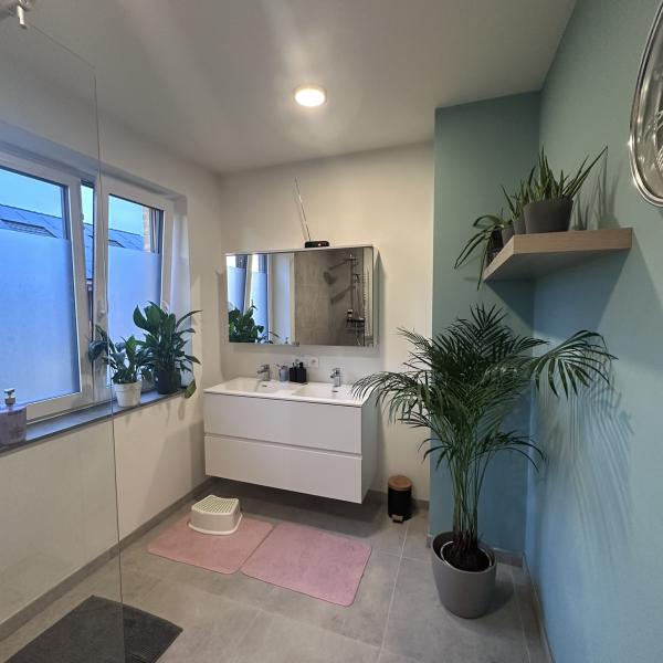 Verdiep +1: Nachthal met apart toilet - 2 slaapkamers - wasplaats - badkamer voorzien van ingemaakte kasten, dubbele spoelbak en inloopdouche.