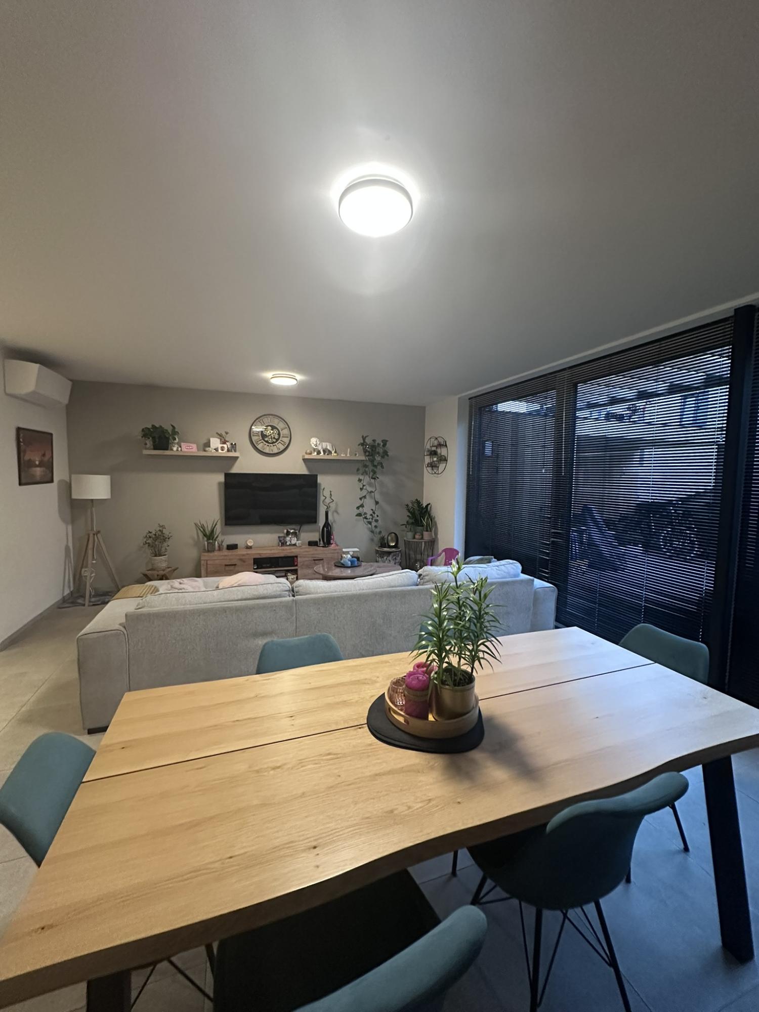 Gelijkvloers: Inkom met apart toilet - leefruimte met open keuken voorzien van inductiekookplaat, dampkap, ingemaakte kasten, ontbijttafel, spoelbak, frigo, combi-oven en vaatwas - berging.